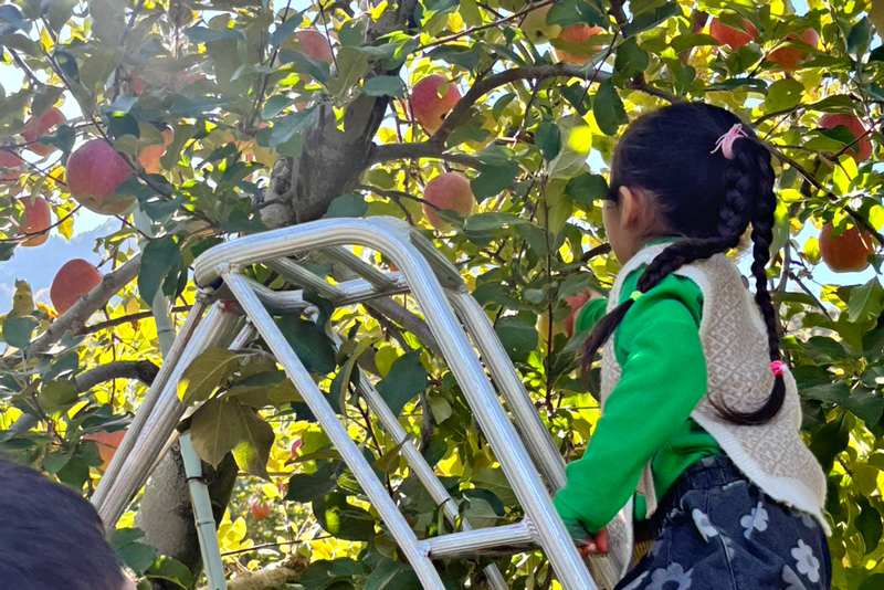 お子さんたちもはしごを使いながら上手に収穫し、摘みたてのりんごを嬉しそうに頬張る姿も見られました。
