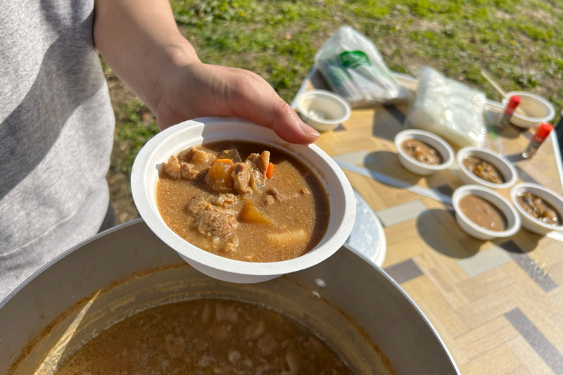 りんご狩り体験のあとは、ご当地のお弁当と、船昌が手がけるレストラン「DEK」のシェフ特製豚汁で昼食タイム。