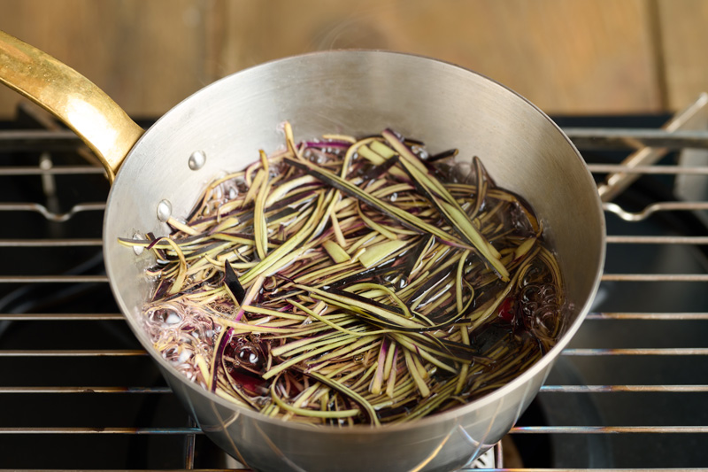 鍋にピクルス液の材料をすべてを入れて沸かし、千切りにしたなすの皮を加えてさっとゆがく。