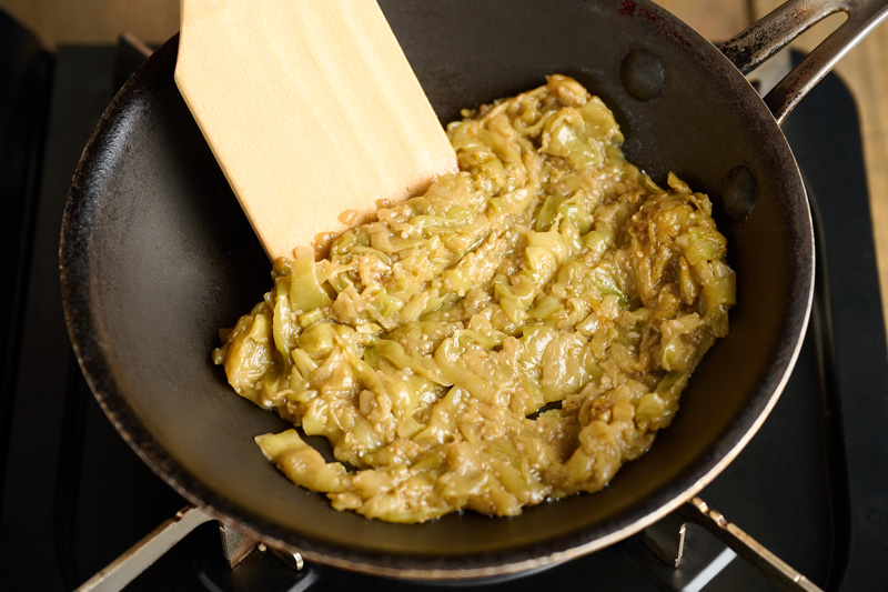 きつね色になったらなすを加えて柔らかくなるまで炒め、塩少々を振る。