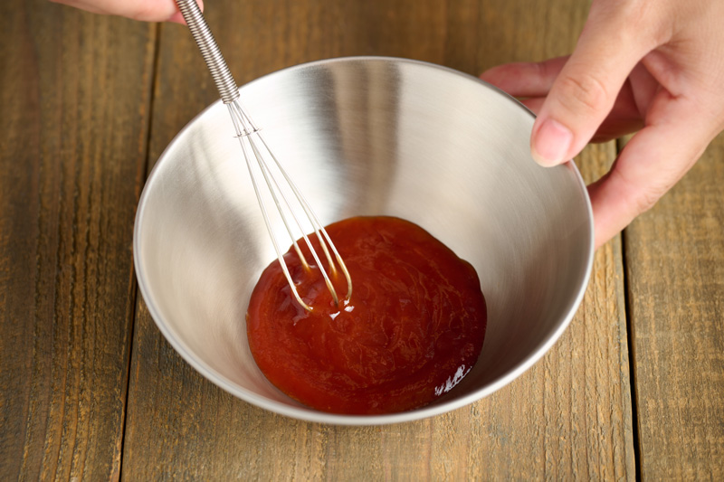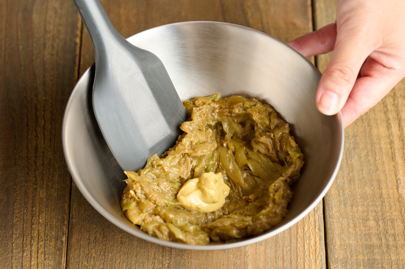 炒めたなすをボウルに移し、マスタードを加えて混ぜる。