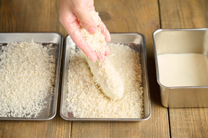 残りの2本のなすに、衣(水+小麦粉)をつけてパン粉をまぶす。