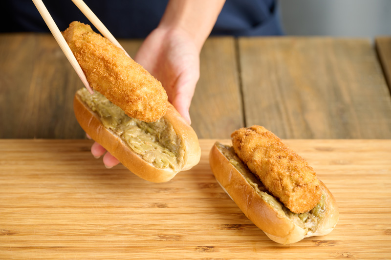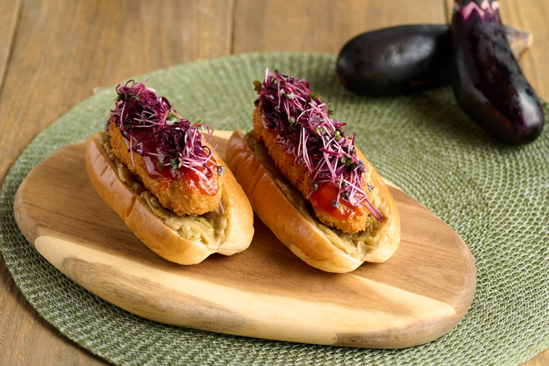 なすを主役に仕立てた、ボリューム満点のホットドック。