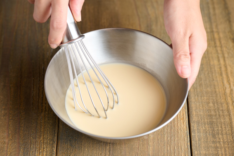 牛乳・生クリーム・バニラエッセンスを加えてさらに混ぜ、茶こしでこす。