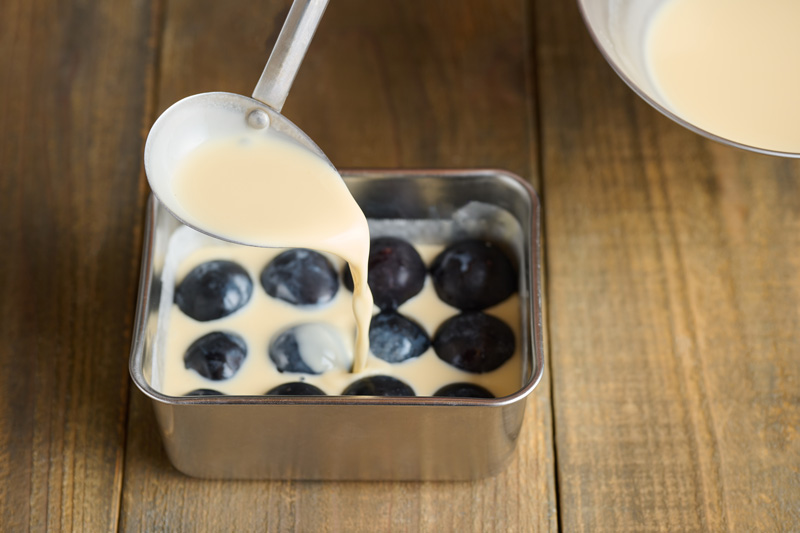 型に生地用のナガノパープルを丸ごと並べ、生地を流し入れる。