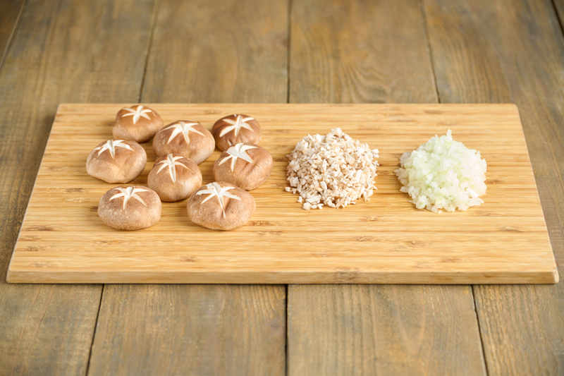 椎茸の軸を切り、傘の部分には包丁で飾り切りを入れる。