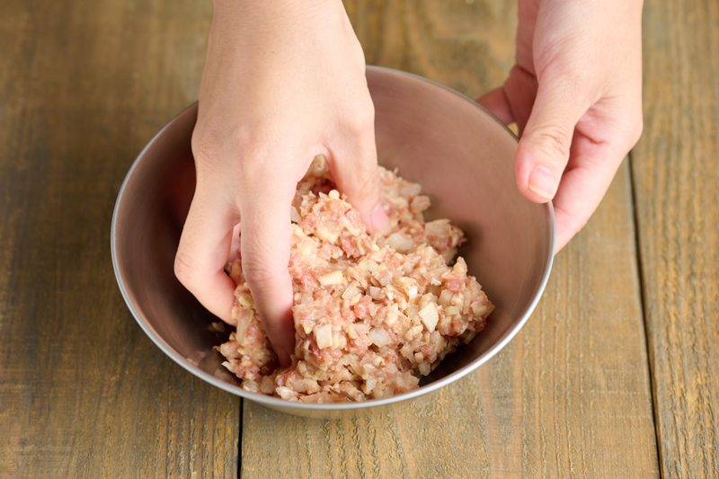 ボウルに豚ひき肉と塩を入れ、粘りが出るまでよく混ぜる。