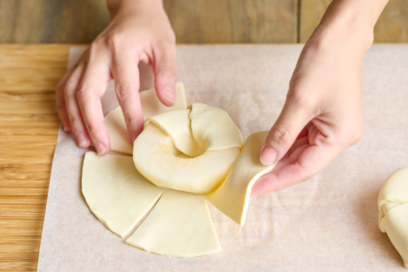 パイ生地の縁から6箇所切り込みを入れて、それを中央へ折り込むようにして洋梨を包み込む。