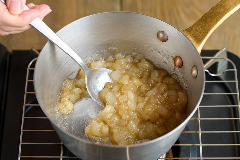 鍋に洋梨・グラニュー糖・レモン汁・カルダモンパウダーを入れ、中火にかけて水分がなくなり、とろみが出るまで煮詰める。