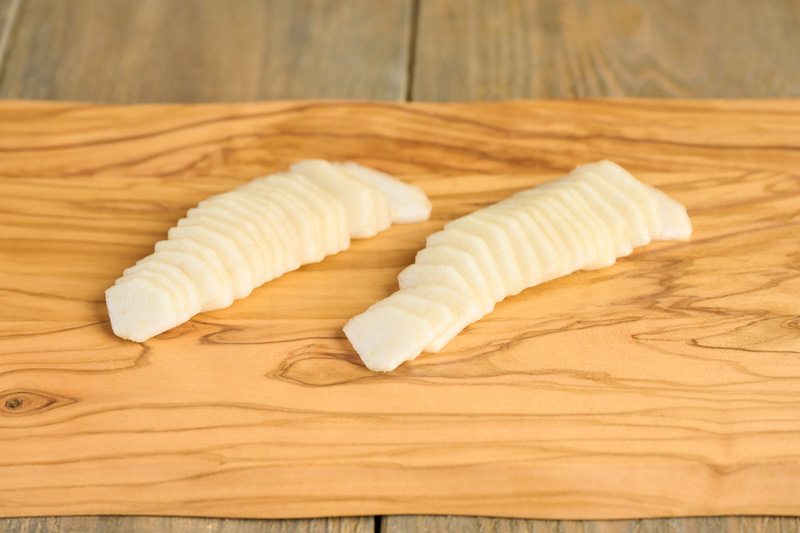それを横半分にカットして、おしり側を1mm厚のいちょう切りにする。