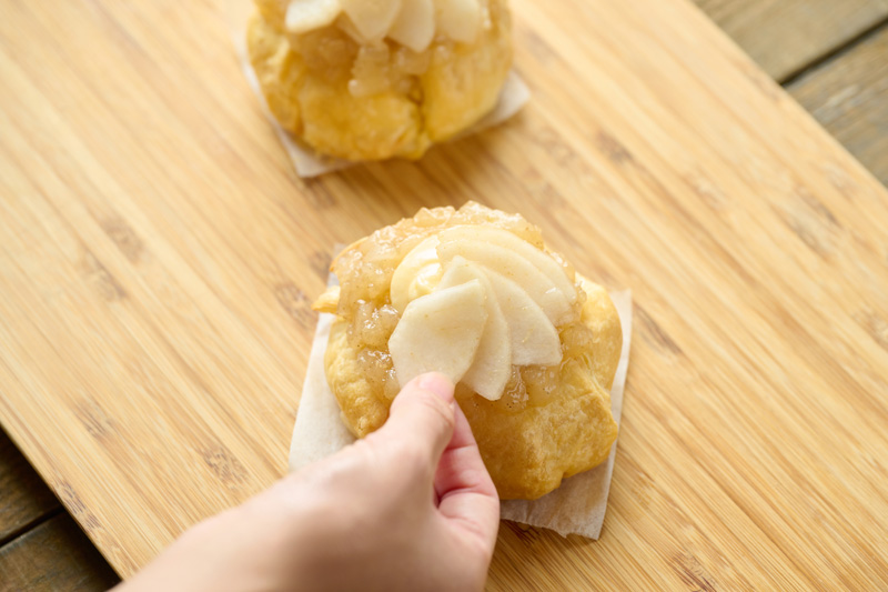 クリームの周りに洋梨ジャムをのせ、スライスした洋梨を立てかけるように飾る。