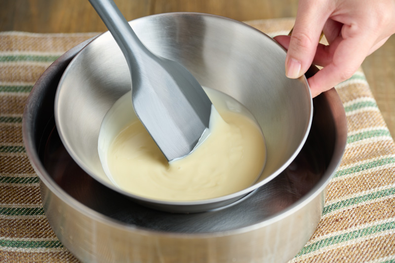 ホワイトチョコをボウルに入れ、湯煎にかけて溶かす。
