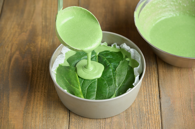 そこに生地を約90g流し入れ、その上にほうれん草の葉を敷きつめる。