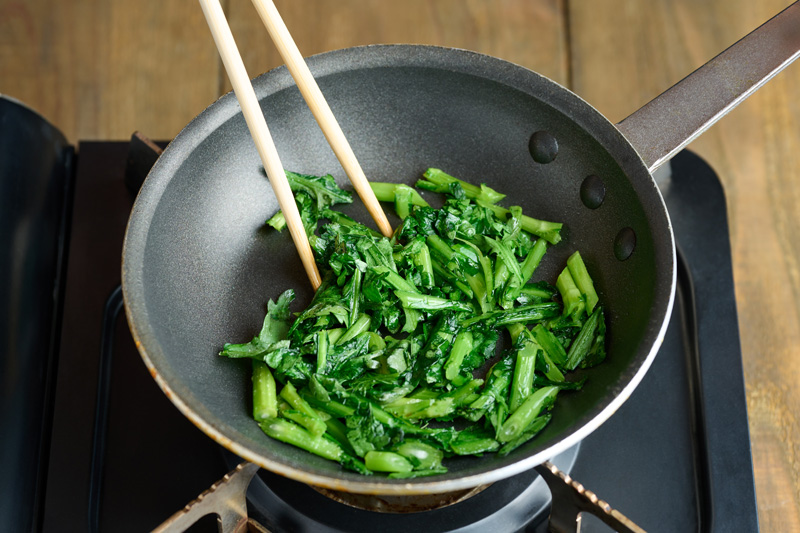 春菊の葉のフレッシュさと、香ばしく炒めた茎の食感もアクセントに。