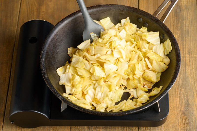 ②と別のフライパンにごま油を引き強火で熱し、キャベツをいためる。