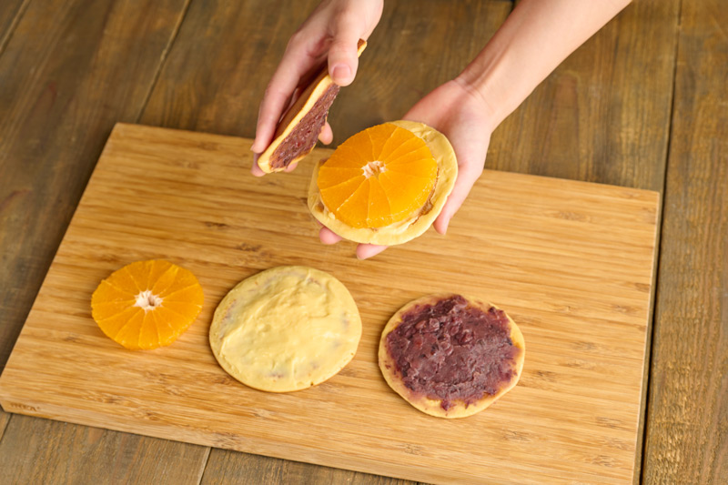 ジューシーなデコポンを贅沢にサンドした、季節感あふれるフルーツどら焼き。