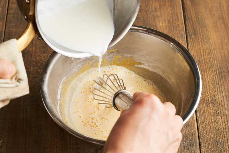 鍋に牛乳とバニラエッセンスを入れて沸かしたら、少しずつボウルに加えながら混ぜる。
