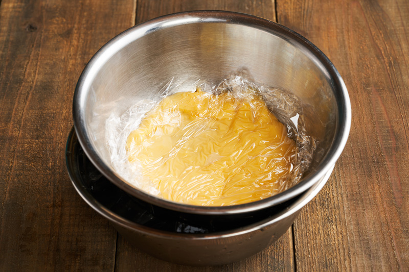 ⑤をボウルに移してラップを密着させ、氷水にあてながら冷やす。